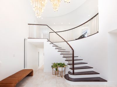 Designed to curve seamlessly into its landscaped surrounds, the home fully embraces its remarkable setting. Expansive alfresco balconies, a fully tiled and heated resort-style pool and spa, and a private lower-level entertaining terrace with bar and outdoor kitchen create a series of exceptional indoor-outdoor spaces. Level lawn areas and a dedicated children’s play gym further enhance its family appeal.