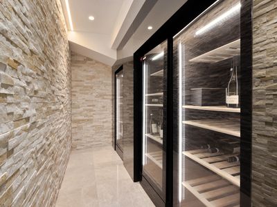 - Second living zone with marble built-in bar and floor-to-ceiling glass